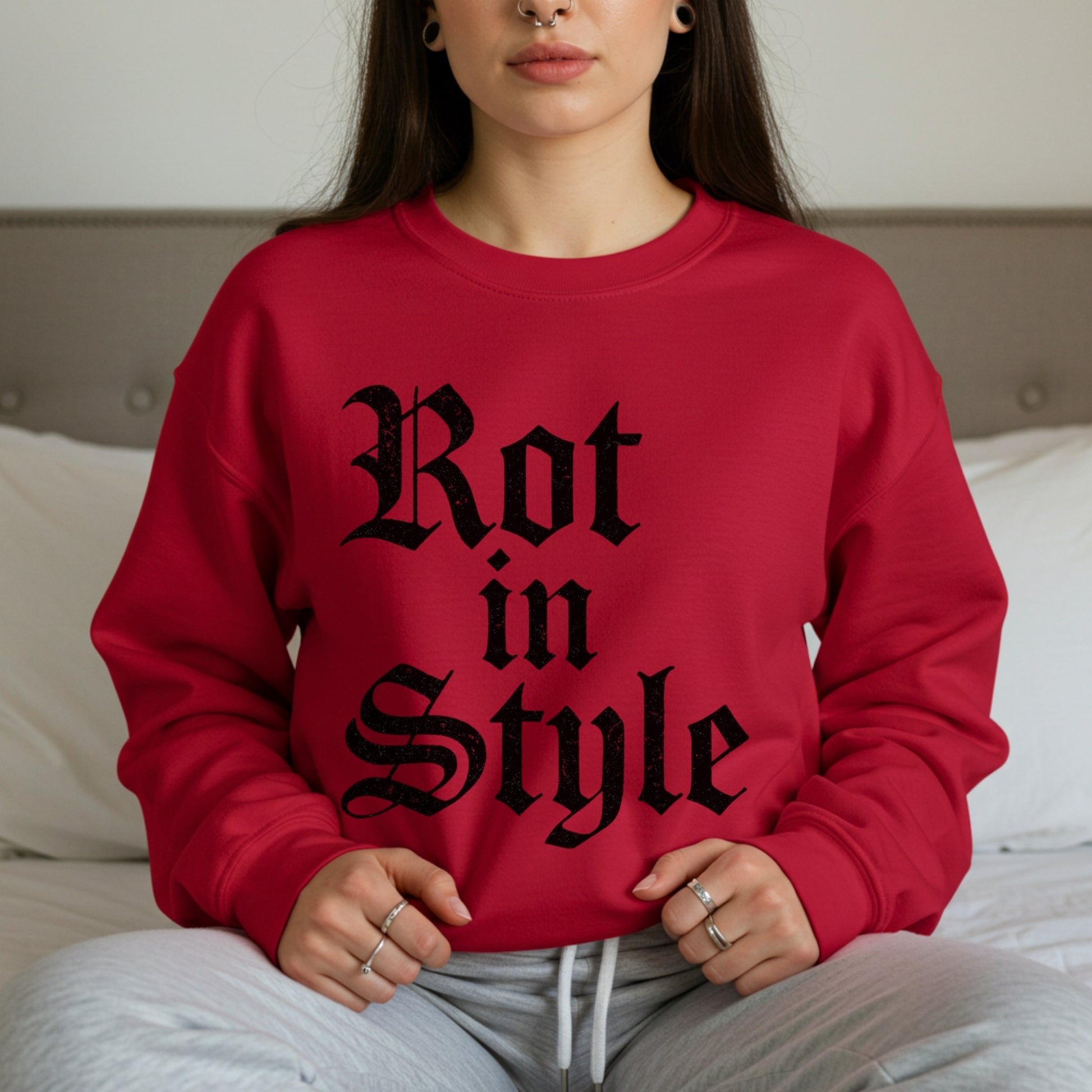 “Rot in Style” isn’t just a phrase—it’s a lifestyle. This sweatshirt pairs the softness of premium fleece with the attitude of gothic typography, giving you that perfect mix of comfort and chaos. Whether you’re layering it under a trench coat, styling it with combat boots, or curling up with your favorite grim novel, this pullover makes your morbidity fashionable.
